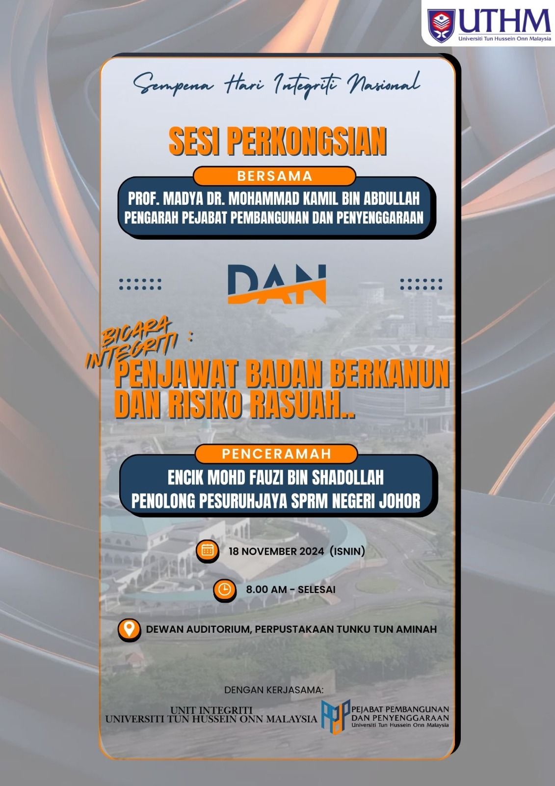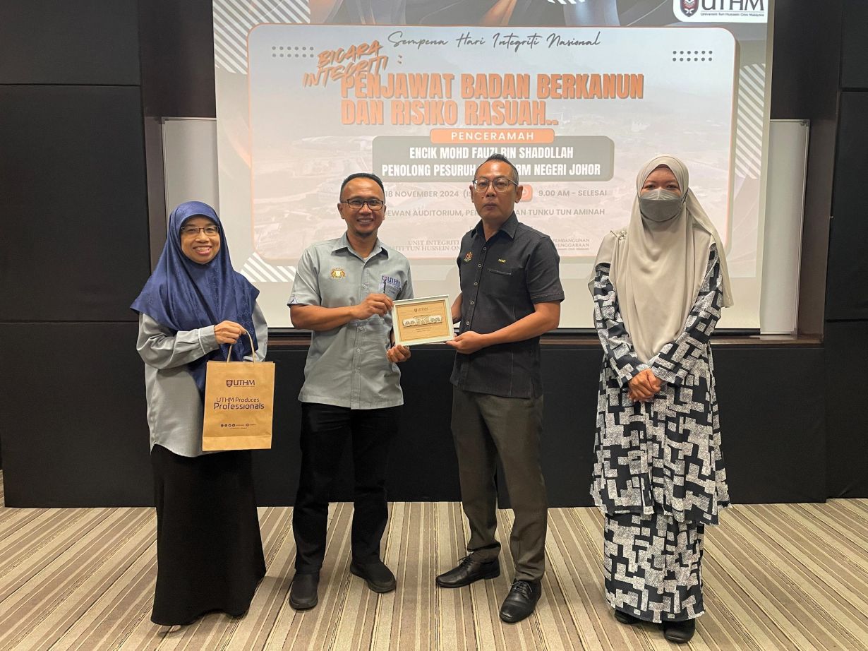 Pada 5 November 2024, sambutan Hari Integriti Nasional telah diadakan dengan objektif membudayakan integriti, memupuk nilai murni, dan memperkukuhkan tadbir urus dalam masyarakat. Bersempena dengan sambutan ini, Unit Integriti UTHM bersama Pejabat Pembangunan dan Penyenggaraan (PPP) telah menganjurkan program bertajuk "Bicara Integriti: Penjawat Badan Berkanun dan Risiko Rasuah", khusus untuk staf PPP.