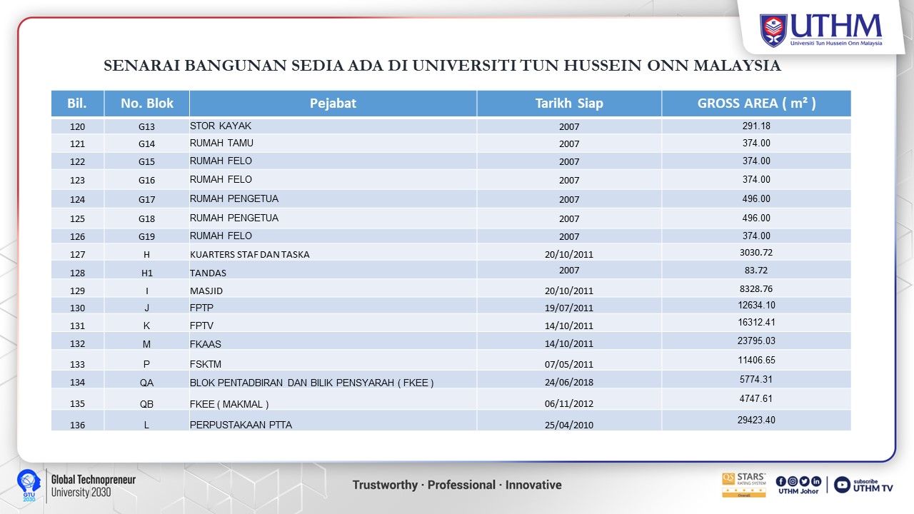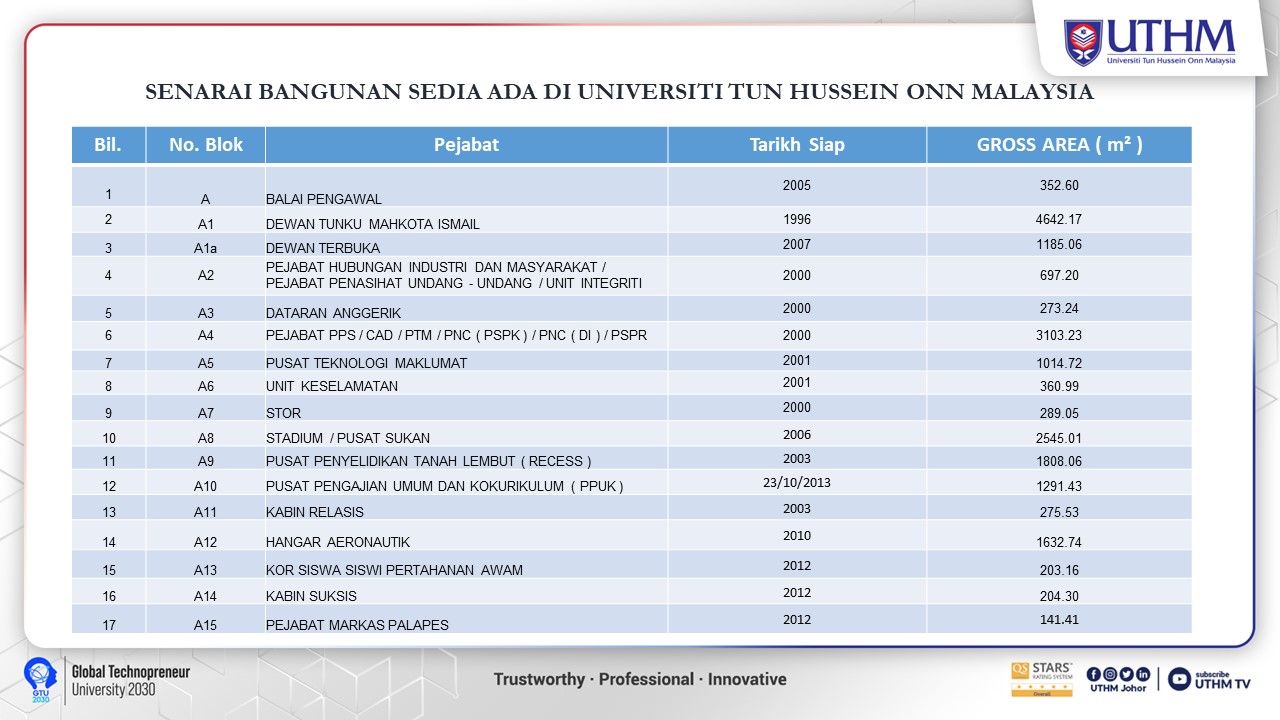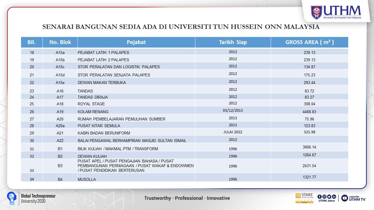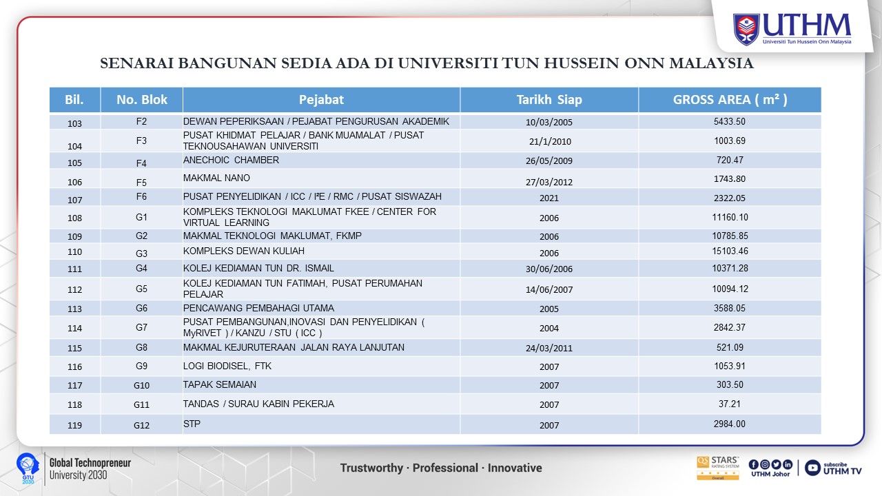 SENARAI BANGUNAN SEDIA ADA DI UNIVERSITI TUN HUSSEIN ONN MALAYSIA
